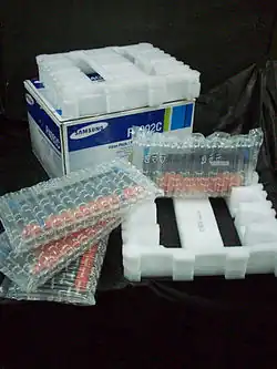 Several constructions have been developed, some as early as the 1970s.[1] In the 1980s, a number of inflatable cushion systems were documented.[2][3][4][5][6] Before 2000, most inflatable air cushions used a single check valve.[7] However if one part of the cushion was punctured then this packaging would completely deflate. In 2002, several types of continuously independent one way air valve films were introduced.[8] These patents incorporated a one way air valve film, which can be produced continuously and independently. If one air tube is punctured, the other air tubes will still remain inflated.