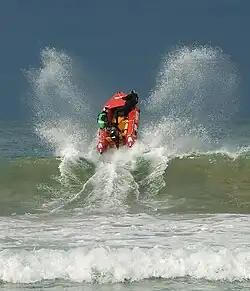 IRBs are made of rubber and consist of four inflatable tubes - two side tubes, a bow tube and a keelson tube. This specific feature coupled with the obvious fact that they are used in the water, has coined the term "rubber duck" or simply "duck" to describe an IRB. Typically the rubber is coloured a shade of red termed 'Rescue Red' although a particular make of craft manufactured by Arancia come in a shade of orange. They have a rigid floor piece and a rigid transom for fitting an outboard motor (usually 25 hp). UK versions are equipped with 30hp Outboard 4-Stroke, with a Prop Deflector fitted to protect swimmers and the engine from rocks. This motor is capable of providing a maximum drive speed of between 25–30 knots on flat water. 2-Stroke fuel is stored in a flexible fuel bladder and is secured by 4 clips to the floor in the bow. An IRB is crewed by two people - an IRB Operator/Driver and an IRB Crewman. The Operator sits on the lower half of the port side pontoon where they operate the outboard motor to control the boat. They have a single foot strap to help them stay in the boat. Their left hand can hold on to a strap on the port side pontoon and their right hand operates the outboard motor by means of a tiller arm and throttle. The Crewman sits on the upper half of the starboard side pontoon. A handle is attached by a rope to the nose of the boat for them to hold with their left hand, while their right hand may hold a strap attached to the starboard pontoon. They balance the boat and allow it to go over large waves before they break without flipping. They also assist when going through a breaking wave, commonly referred to as "punching-through". As of 2011 only one foot strap is available for a crew member.