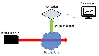 Infrared photodissociation (IRPD) spectroscopy uses infrared radiation to break bonds in, often ionic, molecules (photodissociation), within a mass spectrometer.[1] In combination with post-ionization, this technique can also be used for neutral species. IRPD spectroscopy has been shown to use electron ionization, corona discharge, and electrospray ionization to obtain spectra of volatile and nonvolatile compounds.[2][3] Ionized gases trapped in a mass spectrometer can be studied without the need of a solvent as in infrared spectroscopy.[4]