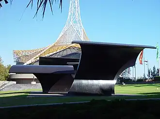 This work was installed in 1980, on a small lawn outside the Union Building at the heart of the University of Melbourne.[52] It is formed from 19mm steel, and consists of two upright steel circles, each 360 cm in diameter, and three folded metal planes; the total length is 6 metres.[53] It provides the students with a unique resting place among its massive unfurling bands and is the focal point of one of the university's busiest outdoor spaces, the Union Lawn.[54] see more images
