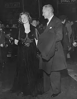 Alfred Hitchcock's Spellbound premiered on 28 December 1945.[49] In Spellbound, Bergman played Dr. Constance Petersen, a psychiatrist whose analysis could determine whether or not Dr. Anthony Edwardes, played by Gregory Peck, is guilty of murder. Artist Salvador Dalí was hired to create a dream sequence but much of what had been shot was cut by Selznick.[50] During the film, she had the opportunity to appear with Michael Chekhov, who was her acting coach during the 1940s.[51] This would be the first of three collaborations she had with Hitchcock.[52]