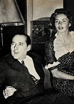 Bergman's first acting role in the United States was in Intermezzo: A Love Story by Gregory Ratoff which premiered on 22 September 1939.[31] She accepted the invitation of Hollywood producer David O. Selznick, who wished her to star in the English-language remake of her earlier Swedish film Intermezzo (1936). Unable to speak English, and uncertain about her acceptance by the American audience, she expected to complete this one film and return home to Sweden. Her husband, Petter Aron Lindström, remained in Sweden with their daughter Pia (born 1938).[10]: 63 In Intermezzo, she played the role of a young piano accompanist, opposite Leslie Howard, who played a famous violin virtuoso. Bergman arrived in Los Angeles on 6 May 1939 and stayed at the Selznick home until she could find another residence.