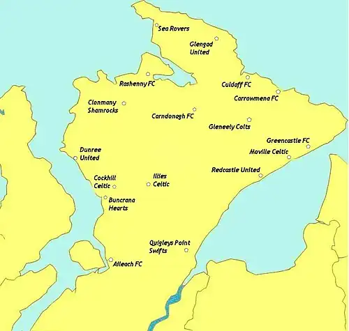 | Moville Celtic F.C. | 1904 | Green & White Hoops | Glencrow, Moville |
