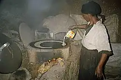 Traditional clay stoves can be inefficient in that they consume large amounts of firewood and produce a lot of smoke, creating household pollution and making them dangerous to use around children.[11] In 2003, an Eritrean research group designed a stove for cooking injera and other foods that uses more easily available fuel, such as twigs instead of large branches, crop residues and dung, locally called kubet.[12] Several parts of this new stove are made in the central cities of Ethiopia and Eritrea, while other parts are moulded from clay by women in local areas.[12]