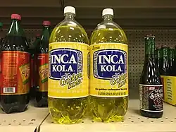 Inca Kola (also known as "Golden Kola" in international advertising)[1] is a soft drink that was created in Peru in 1935 by British immigrant Joseph Robinson Lindley.[2] The soda has a sweet, fruity flavor that somewhat resembles its main ingredient, lemon verbena (not to be confused with lemongrass, both of which can be known as hierbaluisa in Spanish).[3][4][5] Americans compare its flavor to bubblegum or cream soda, and it is sometimes categorized as a champagne cola.[6]