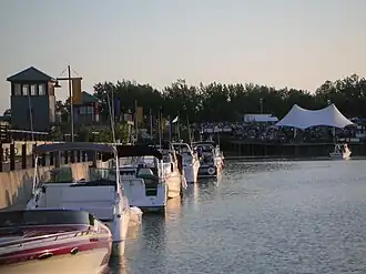 In July 1993, the harbor area saw ground broken on that part of the Onondaga Creekwalk[2] passing through. Expected completion was October 1993. The area would eventually qualify as a scenic waterfront park with the addition of park amenities and event facilities—including an overlook platform and amphitheater, and a sand beach volleyball court.