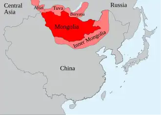 The Inner Mongolian independence movement (Chinese: 内蒙古独立运动), also known as the Southern Mongolian independence movement (Chinese: 南蒙古独立运动), is a movement for the independence of Inner Mongolia (also known as Southern Mongolia[1]) and the political separation of Inner Mongolia from the People's Republic of China.[2] It is principally led by the Mongolian diaspora in countries like Japan and the United States, and in some European countries.[3]
