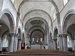 The interior has a nave and two aisles, the latter smaller in height, with a transept, a presbytery and three aisles. At the crossing is a crypt. This houses a 13th-century wooden sculpture portraying on the two patron saints of the church.