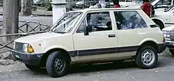 In April 1982, at the same time as the engines were changed for Daihatsu units, the Mini's original rubber suspension was changed to a more conventional (and comfortable) independently developed layout with MacPherson struts in the front and an independent, rear suspension with lower wishbones and a transverse single-leaf spring which also acted as a stabilizer.[11][12] To indicate the new engines, the cars were renamed Innocenti Tre Cilindri, or simply "Tre" (three). The new engines and suspension carried with them a weight penalty of about 55 kg (121 lb).[9] The new Innocentis were nearly indistinguishable from their predecessors, the external changes being limited to badging and a chin spoiler. In January 1984, along with a gentle facelift, they were renamed Minitre (sometimes written "Mini 3"). Most of the new parts came straight from the Daihatsu Charade. European exports, which had hitherto been managed by local British Leyland affiliates, were either halted or generally slowed down. For the first year or two, Minitres were limited to exporting to France, Belgium, and Switzerland. In 1983, the German Daihatsu importer Walter Hagen took over sales there, after a hiatus of over a year.[13] The old Leyland-engined versions continued to be sold until stocks ran out. In spite of the new model, production dropped steadily: from 23,187 in 1981 to 21,646 the next year to 13,688 in 1983, the first year in which all cars were Daihatsu-engined.[14][15] During 1984, sales shot up again as the car had regained its credibility. Carrozzeria Embo displayed a convertible version of the Minitre SE, called a Spyder, but de Tomaso decided against series production.