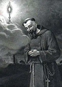 During the time in the parish he found a need for solitude, prayer and penance. In 1874 he entered the Order of Friars Minor at the Annunciata Convent in the village of Borno. In 1878 he made his solemn vows and took the name of "Innocenzo of Berzo". He spent a year in Albino. Except for short assignments of preaching spiritual exercises in some convents in Lombardy, he remained at the Annunicata Convent.[2] There he lived a life of intense abandonment, living the adage of "do good and disappear". He had a deep devotion to the Blessed Sacrament, finding his sustenance in front of the Tabernacle. He also had a devotion to the crucified Jesus Christ, and encouraged penitents to the exercise of the Way of the Cross.