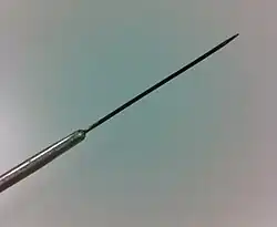 An inoculation needle is a laboratory equipment used in the field of microbiology to transfer and inoculate living microorganisms.[1] It is one of the most commonly implicated biological laboratory tools and can be disposable or re-usable.[1] A standard reusable inoculation needle is made from nichrome or platinum wire affixed to a metallic handle.[2][3] A disposable inoculation needle is often made from plastic resin. The base of the needle is dulled, resulting in a blunted end.[2][3]