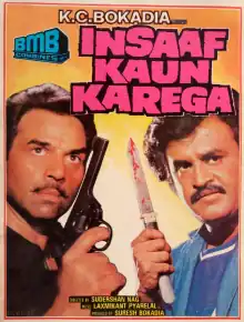 Insaaf Kaun Karega (transl. Who will deliver justice?) is a 1984 Indian action film directed by Sudarsan Nag and written by K. C. Bokadia. It stars Dharmendra, Rajinikanth, Jaya Prada, Madhavi.[1] It was a hit at the box office.