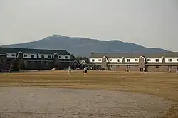 Monadnock is derived from an Abenaki term for an isolated hill or a lone mountain that stands above the surrounding area, typically by surviving erosion. Geologists took the name from Mount Monadnock in southwestern New Hampshire.[4] It is thought to derive from either menonadenak (transl. smooth mountain) or menadena (transl. isolated mountain).[5] In this context, monadnock is used to describe a mountain that rises from an area of relatively flat and/or lower terrain. For instance, Mount Monadnock rises 610 metres (2,000 ft) above its surrounding terrain and stands, at 965 m (3,165 ft), nearly 300 m (1,000 ft) higher than any mountain peak within 48 km (30 mi).[6]
