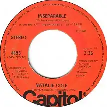 "Inseparable" is a 1975 R&B/Soul song originally recorded by American singer Natalie Cole. Released in November 1975, it was her second straight number one single on the Hot Soul Singles chart,[2] from her debut album of the same name, and also reached number thirty-two on the Billboard Hot 100 Singles chart.[3]