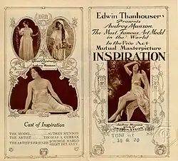 Inspiration is a 1915 American silent drama film directed by George Foster Platt and written by Virginia Tyler Hudson and starring Audrey Munson,[1] an artist's model known at the time for posing for several statues in New York City and the 1915 San Francisco Panama–Pacific International Exposition. It is believed to be one of the first non-pornographic American films to feature full nudity, with Munson frequently appearing naked as a sculptor's model. On its reissue in 1918, the film was renamed as The Perfect Model.