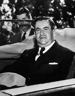Miguel Alemán was the PRI's candidate in the 1946 elections, but he did not run unopposed. Alemán and his circle had hoped to abandon sectoral representation in the party and separate the party as an organism of the state, but there was considerable pushback from the labor sector and the CTM, which would have lost influence, along with the other sectors. The structure of the party remained sectoral, but the Alemanistas abandoned the goal that had been "the preparation of the people for the implementation of a workers' democracy and for the arrival of a socialist regime."[70] The party slogan was changed from the PRM's "[f]or a workers' democracy" (Por una democracia de trabajadores) to the PRI's "[d]emocracy and justice" (Democracia y justicia).