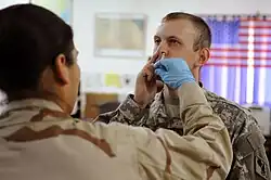Insufflation (Latin: insufflare, lit.'to blow into') is the act of blowing something (such as a gas, powder, or vapor) into a body cavity.[1] Insufflation has many medical uses, most notably as a route of administration for various drugs.