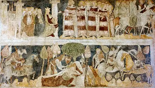 Interlace, known in the Middle Ages as entrelacement, was a narrative device developed in Medieval literature, especially the tapestry romances in France.[1][3] Rather than seeking to make a story as clear as possible with a main plot and subsidiary storylines as in a modern novel, the interlaced medieval tale aimed to reflect the confusing flow of events that people perceive in the world. The Tolkien scholar Richard C. West gives as example the 13th century Queste del Saint Graal, where the holy grail is just one goal, while the knights Bors, Galahad, Gawain, and Lancelot all pursue their own adventures, for readers to compare and contrast. Outside France, a form of interlace is seen in Ovid's Metamorphoses from ancient Rome,[4] in the Old English epic poem Beowulf[5] (on which Tolkien was an expert, as in his lecture "Beowulf: The Monsters and the Critics"),[6] and in the English poet Edmund Spenser's 1590 Faerie Queene.[4]