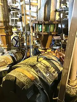 The fountain is controlled remotely from the north side of Seattle Center, and the pumping machinery is contained 30 feet (9.1 m) below the fountain floor. Two moats of water feed the jets: one moat for the "micro shooters" and another moat for the "fleur-de-lis" and "super shooters". The fountain recirculates the water and filters it through sand.[9] During certain times of the day, the water display is synchronized to music for up to twelve minutes.[2] The fountain jet designs are patented by WET.[10][11]
