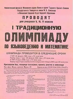 Thus, in 1965, the first edition of the Moscow's Traditional Olympiad on Linguistics and Mathematics was held, with an Organizing Committee composed of Uspensky (president), Igor Miloslavsky,[5] Alexander Kibrik and Anna Polivanova. The Problem Committee consisted of Zhurinsky (the author of most of the problems) and Zaliznyak, plus Boris Gorodetsky[6] (president), Alexandra Raskina[7] and Victor Raskin.[8][9] The Moscow Olympiad was held regularly until 1982 and resumed again in 1988, being still held nowadays.[10]