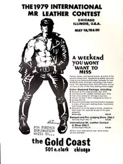The forerunner of the competition was the Mr. Gold Coast contest held through the 1970s at Chicago's Gold Coast leather bar, owned by Chuck Renslow and his partner Dom Orejudos.[4] This contest became one of the bar's most popular events, causing the need to relocate the competition to a larger venue by 1979, at which point Renslow decided to change the name to "International Mr. Leather".[4][2] Flyers and promotional materials for this first IML were sent to every leather bar that Renslow and his associates knew of, not knowing if the historically regional contest would actually be able to attract a global audience. Fortunately, by the contest's second year, it would go on to actually live up to its name.