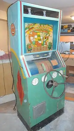 International Mutoscope Reel Company released various electro-mechanical games (EM games) for arcades in the 1940s. In 1941, International Mutoscope Reel Company they released the driving game Drive Mobile, which had an upright arcade cabinet similar to what arcade video games would later use.[2] It was derived from older British driving arcade games from the 1930s. In Drive Mobile, a steering wheel was used to control a model car over a road painted on a metal drum, with the goal being to keep the car centered as the road shifts left and right. Kasco introduced this type of electro-mechanical driving game to Japan in 1958 with Mini Drive, which followed a similar format but had a longer cabinet allowing a longer road.[3]