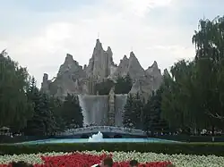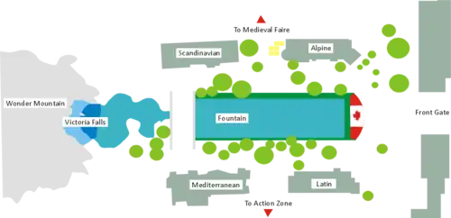 One of the first sights seen on entering the park is a large flowerbed representing the Canadian flag. The bed is empty during the park's first weeks of being open and is replaced with a faux graveyard during the autumn for Halloween Haunt. Approximately 11,000 begonias are planted in the bed, which is 80 feet (24 m) by 50 feet (15 m) in size.[3] Behind it is a large fountain area, with a variety of water patterns all day and lighting effects at night. A pathway structure, modeled to look like an arch bridge, contained (as of 1982) a computer that controlled the fountain's 93 pneumatic valves and nozzles and its 504 red, white, and turquoise lights.[2] In 1982, the lighting patterns would change roughly every 30 seconds, with a 30-minute rotation.[2] In 2011, the lights were upgraded to offer a range of 16 million colours.[4] Before the park opened, the 300-foot (91 m) by 80-foot (24 m) water basin was referred to as Royal Fountain.[5]