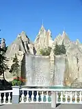Wonder Mountain is a steel structure, its meshing covered in autumn 1980 with three layers of gunnite, a special type of cement that was later roughened to make it look like rock.[5] Pumps within the mountain push the water over the waterfall. This water helped cool the park's air conditioning units, stored in a 30 by 12-metre (100 by 40-foot) room inside the mountain.[2] The waterfall itself is named Victoria Falls, and was reportedly based on Victoria Falls,[32] the largest waterfall in the world, which straddles the border between Zambia and Zimbabwe. In 2011, the park's "Victoria Falls" was still listed as powering its air conditioning.[33] The mountain itself was slow to be named. Park publicist Mike Filey suggested in July 1980 that it might be named after Canadian-born Max Aitken, Lord Beaverbrook. Beaverbrook is typically associated with New Brunswick, where he moved at age 13 and started his first newspaper, and with the United Kingdom, where he became a newspaper baron. The Globe and Mail speculated that it might be named Mount Maple, to soothe relations with the local community, or that there might be a naming contest.[34]