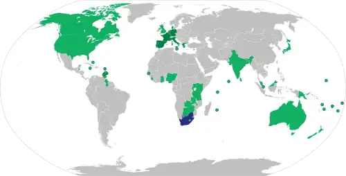 By this time, after much debate, the United States, the United Kingdom, and 23 other nations had passed laws placing various trade sanctions on South Africa. A disinvestment from South Africa movement in many countries was similarly widespread, with individual cities and provinces around the world implementing various laws and local regulations forbidding registered corporations under their jurisdiction from doing business with South African firms, factories, or banks.[25] The UK's significant economic involvement in South Africa may have provided some leverage with the South African government, with both the UK and the US applying pressure and pushing for negotiations. However, neither the UK nor the US was willing to apply economic pressure upon their multinationals in South Africa, such as the mining company Anglo American.[26][27][28] The effect of Western influence in the anti-apartheid movement and specifically US/UK economic and political considerations in refusing many sanctions until the late 80s is still a debated topic.[29][30][31]