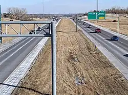 An additional interchange was proposed at Benson Road in northeastern Sioux Falls in the 1980s to serve planned industrial parks in the area and was formally approved by the state government in 1989.[34] It was scheduled to be completed in November 1991, but was delayed due to construction issues; the ramps were barricaded over the winter months, but were moved by motorists who used the unfinished interchange as a shortcut.[35] The interchange opened in 1992 and was the first in eastern South Dakota to have planted wildflower patches to beautify the area, but they were later mowed due to excessive growth and the introduction of invasive weeds.[36][37]