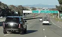 Interstate 380 (I-380) is a short 3.3-mile (5.3 km) east–west auxiliary Interstate Highway in the San Francisco Bay Area of Northern California, connecting I-280 in San Bruno to US Route 101 (US 101) near San Francisco International Airport. The highway primarily consists of only three intersections: I-280, State Route 82 (SR 82/El Camino Real), and US 101. Like the nearby I-280, I-380 never connects to I-80, its parent Interstate Highway. However, there is no rule that says that spur routes need to do so. (Similarly, the spur route I-795 branches off from I-695, a beltway around Baltimore, and is only indirectly linked to I-95.)