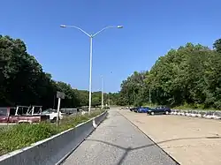 Many of the civic groups, however, still opposed I-70 passing through Gwynns Falls/Leakin Park; the groups used litigation and political will to indefinitely delay the construction of I-70 through the park.[56] In 1981, the city canceled the portion of I-70 from its current eastern terminus through Gwynns Falls/Leakin Park to the Interstate's interchange with I-170. I-170 and the portion of proposed freeway south to I-95 remained part of plans with a new designation for the L-shaped freeway, I-595.[9] In 1983, however, I-595 was canceled as well due to escalating costs; saving funds for the original I-595 freeway would detract from more pressing needs like maintenance of city streets and rapid transit.[9][56] I-595 was later used as an unsigned designation for the upgrade of US 50 between the Capital Beltway and Annapolis.[1] With the abandonment of I-70's extension further into the city, the Baltimore City Department of Transportation converted the Interstate's stub end east of Security Boulevard (MD 122) into a park-and-ride facility that opened in September 1985.[57] At the once-planned I-95 interchange, a flyover ramp that was to become the ramp from eastbound I-70 to southbound I-95 was demolished in 1997, though several other ramp stubs remain in place.[61]