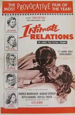 Intimate Relations (U.S. title Disobedient [1]) is a 1953 British drama film directed by Charles Frank and starring Harold Warrender and Marian Spencer.[2] It was written by Frank based on the 1938 play Les Parents terribles by Jean Cocteau.[3] It was entered into the 1953 Cannes Film Festival.[4]