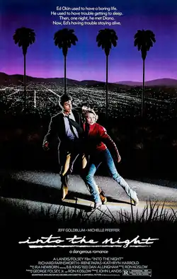 Into the Night is a 1985 American black comedy action thriller film directed by John Landis, starring Jeff Goldblum and Michelle Pfeiffer. The film focuses on an insomniac aerospace engineer (Goldblum), who is approached by a jewel smuggler (Pfeiffer) whose life is in danger, on the run from several international foes.