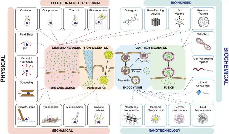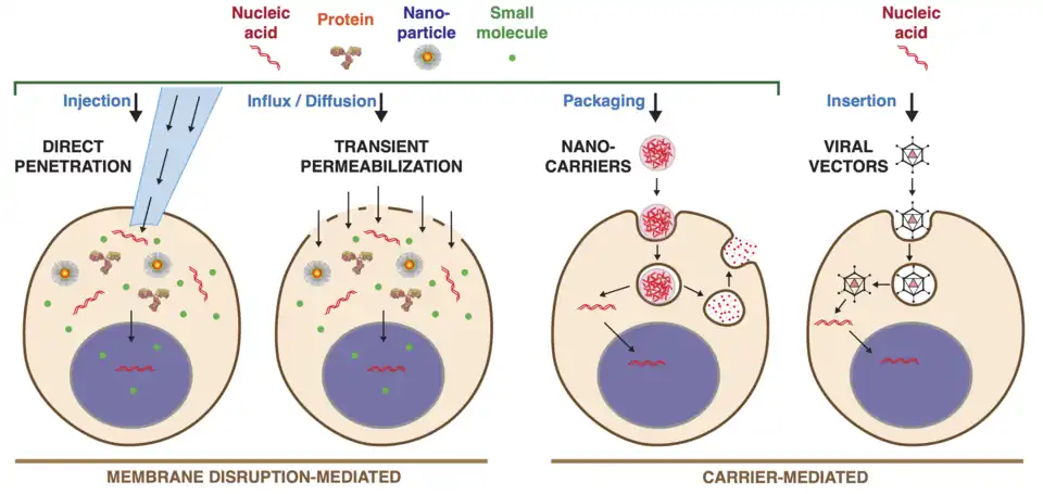 - ^ a b c d Stewart, Martin (2016). "In vitro and ex vivo strategies for intracellular delivery". Nature. 538 (7624): 183–192. Bibcode:2016Natur.538..183S. doi:10.1038/nature19764. hdl:1721.1/110923. PMID 27734871. S2CID 2628005.