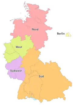 The second tier mainly experienced an influx of former Oberliga clubs that failed to gain entry to the Bundesliga or had not applied in the first place. The South, West and Southwest saw their 2nd Oberligas simply renamed to Regionalliga. In Berlin and the North, where there had not been a 2nd Oberliga, Regionalligas were formed. Especially for the North, that meant that the second tier was now formed of only one league instead of five.[15] In regards to promotion to the first tier, which had been automatic until 1963, the number of tier-two leagues now made such a system impossible. Instead, the league champions and, except Berlin, the runners-up, entered a promotion round to determine the two promoted teams. A pre-qualifying was held to reduce the number of teams from nine to eight, these eight would then play in two groups of four a home-and-away schedule. The two group winners were then promoted. After 1966, this was expanded to ten teams in two groups of five, with the Berlin runners-up now also qualifying. This system was to remain in place until the next reform of the German league system in 1974, when the 2nd Bundesligas were introduced.[16]