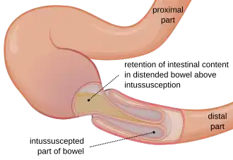 Intussusception is a medical condition in which a part of the intestine folds into the section immediately ahead of it.[1] It typically involves the small intestine and less commonly the large intestine.[1] Symptoms include abdominal pain which may come and go, vomiting, abdominal bloating, and bloody stool.[1] It often results in a small bowel obstruction.[1] Other complications may include peritonitis or bowel perforation.[1]