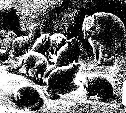 In Shikoku, there are many folk tales and legends about tanuki, but the tanuki of Matsuyama in particular has a history of them that goes back to the beginning of history in the ages of Emperor Tenji, and as a result of tanuki giving birth to tanuki, there were 808 of them. Its leader was Inugami Gyōbu. He lived in an old cave in Kumayama, and was a bake-danuki that continued to protect the Matsuyama Castle, and from his household of 808 tanuki, was also called "Eight Hundred and Eight Tanuki (八百八狸, Happyakuya-danuki)."[4] He was said to have the greatest divine power in Shikoku.[5]