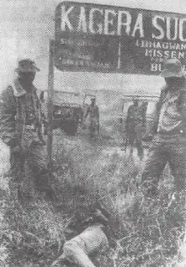 ![]() Ugandan soldiers stand next to a dead Tanzanian, identified as "foe", during the invasion of Kagera.[1] | |||||||||