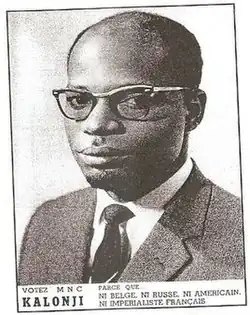 An anti-colonial Pan-African and nationalist movement developed in the Belgian Congo during the 1950s, primarily among the évolué class (the urbanised black bourgeoisie). The movement was divided into a number of parties and groups which were broadly divided on ethnic and geographical lines and opposed to one another.[6] The largest, the Mouvement National Congolais (MNC), was a united front organisation dedicated to achieving independence "within a reasonable" time.[7] It was created around a charter which was signed by, among others, Patrice Lumumba, Cyrille Adoula and Joseph Ileo.[8] Lumumba became a leading figure and by the end of 1959, the party claimed to have 58,000 members.[9] However, many found the MNC was too moderate. A number of other parties emerged, distinguished by their radicalism, support for federalism or centralism and affiliation to certain ethnic groupings. The MNC's main rival was the Alliance des Bakongo (ABAKO) led by Joseph Kasa-Vubu, a more radical party supported among the Kongo people in the north, and Moise Tshombe's Confédération des Associations Tribales du Katanga (CONAKAT), a strongly federalist party in the southern Katanga Province.[10]