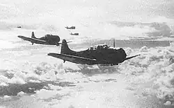 Yorktown's second strike—utilizing the same aircraft—returned to Tulagi and began their attack at 12:10 on the Japanese ships, many of which were now at full steam and attempting to put distance between themselves and Tulagi harbor. The second strike hit and sank the minesweepers #1 and #2 and severely damaged Tama Maru northeast of Savo Island. Another Japanese seaplane was shot down by a U.S. dive bomber during the second strike. After four F4F-3/3A Wildcat fighters from Yorktown joined the strike, the fighters shot down two more Japanese floatplanes over Florida Island. The four U.S. fighters then strafed Yūzuki, killing her captain and nine others of her crew, and causing moderate damage to the ship. Two or three other Japanese floatplanes were damaged in Tulagi harbor and their crews were killed.[32][34][35][36]
