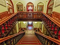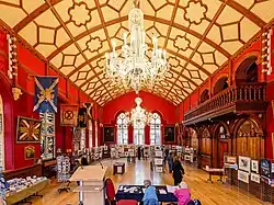 The design was modelled on The McManus, an art gallery and museum in Dundee which had been designed by George Gilbert Scott and completed in 1867.[4] It involved a symmetrical main frontage with seven bays facing onto the High Street; the middle bay featured an arched doorway with a gablet roof on the ground floor, a mullioned window with the town's coat of arms carved into a panel on the first floor and a mullioned window in the attic all flanked by tourelles.[1] The outer bays contained trefoil headed mullioned windows on the ground floor, mullion windows with tracery on the first floor and bartizans at the building corners.[1] Internally, the principal rooms were the main hall, the council chamber and the committee room.[4] The entrance vestibule leading to the staircase was lit by stained glass designed and manufactured by Adam & Small.[1][9]