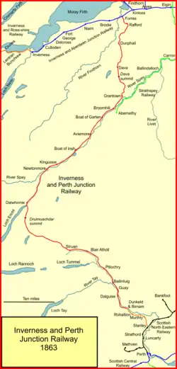 The Inverness and Perth Junction Railway was formed by the Inverness and Perth Junction Railway Act 1861 (24 & 25 Vict. c. clxxxvi) on 22 July 1861, with share capital of £654,000.[9] The route was to involve two summits at high altitude in crossing the mountains. The line would run to Dunkeld and join the existing Perth and Dunkeld Railway (P&DR) there; the P&DR ran from its "Dunkeld" station (actually in Birnam) to Stanley on the Scottish North Eastern Railway, and running powers into Perth were granted. The 103-mile route from Forres to Aviemore was extremely thinly populated, generating very little intermediate traffic.[10] It had a summit altitude at Druimuachdar of 1,484 feet; the summit at Dava was 1,052 feet above sea level.[11] The Inverness and Aberdeen Junction Railway would work the line.[8]