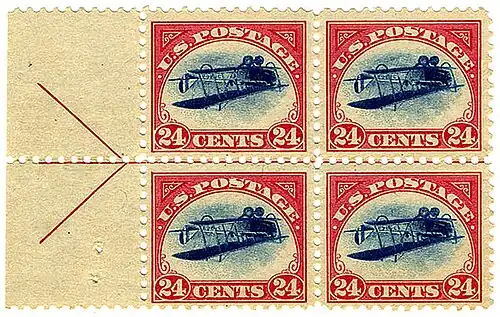In 2014, the mass media renewed long-dormant public attention to the 1955 theft of an even more spectacular Jenny specimen. This was a block of four (positions 65, 66, 75, 76) with a vertical red guide-line through its center, owned by the collector Ethel McCoy, which was stolen from a stamp show at a Norfolk hotel where it was being exhibited. The top right stamp from this block has never been found; the two left stamps surfaced in the 1970s as single copies offered in auction catalogues and were recovered by the FBI, although they had been camouflaged by minor mutilation: the portions of the right-edge perforations on which parts of the guide line were originally visible had been trimmed off or abraded to remove the red ink.[24] Mrs. McCoy's will had made the American Philatelic Research Library the legal owner of all four stamps in the block. In 2014 Donald Sundman of the Mystic Stamp Company offered $100,000 in reward money—$50,000 for the two stamps that were still missing—to anyone who could bring them to their rightful owner. The offer was publicized in The New York Times[25] and on national network news.