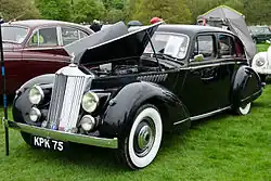 The name was revived in 1946 by an organisation calling themselves Invicta Cars of Virginia Water Surrey[12] who began making the Black Prince. Meadows engines were again used, this time a twin overhead camshaft 3-litre six with three carburettors giving 120 bhp. The aluminium-bodied cars – steel supplies were effectively non-existent for new businesses in Britain's new centrally planned economy – were extremely complex and very expensive with a torque converter (Brockhouse Hydro-Kinetic Turbo Transmitter) entirely replacing the gearbox. The torque converter was controlled by a small switch with forward and reverse positions. Suspension was fully independent using torsion bars and there were built-in electric jacks. Other innovative luxury items included a trickle-charger to charge the battery from the domestic mains, an immersion heater in the engine, interior heating of the body and a built-in radio.[13] About 16 were made, 12 of which have survived.[14] The new company lasted until 1950, when it was bought by Frazer Nash makers, AFN Ltd.[5]