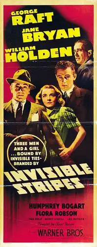 Invisible Stripes is a 1939 Warner Bros. crime film starring George Raft as a gangster unable to go straight after returning home from prison. The movie was directed by Lloyd Bacon and also features William Holden, Jane Bryan and Humphrey Bogart. The screenplay by Warren Duff was based on the novel of the same title by Warden Lewis E. Lawes, a fervent crusader for prison reform, as adapted by Jonathan Finn.