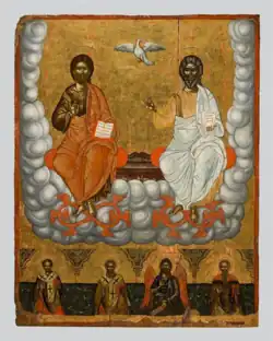 Ioannis was born on the island of Mylos. The family originally came from Crete. Antonios Skordilis and Emmanuel Skordilis were active all over the Cycladic islands. They were both very wealthy priests. Not much is known about his life, luckily he signed and dated most of his work. He was active between 1711-1740. A large majority of his artwork is on the Cycladic islands namely Tinos, Sifnos, and Kythnos. Most of Ioannis's work is a reflection of the traditional Greek mannerisms prevalent at the time. The Holy Trinity with the Saints Eleftherios, Athanasios, Ioannis Prodromos, and Charalambos is an example of the style. The item was painted in 1738. The Dimensions are (88 cm x 70 cm) (2.88714 ft X 2.29659 ft).[5]