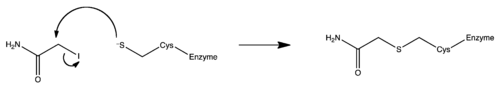 - ^ Smythe CV (1936). "The reactions of Iodoacetate and of Iodoacetamide with various Sulfhydryl groups, with Urease, and with Yeast preparations". J. Biol. Chem. 114 (3): 601–12. doi:10.1016/S0021-9258(18)74789-3.