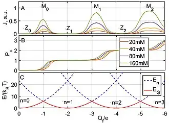 The ICB oscillations in conductance correspond to a Coulomb staircase in the pore occupancy , with transition regions corresponding to and saturation regions corresponding to (Fig.3B) . The shape of the staircase is described by the Fermi-Dirac (FD) distribution,[2] similarly to the Coulomb staircases of quantum dots.[5] Thus, for the transition, the FD function is: Here is the excess chemical potential for the particular ion and is an equivalent bulk occupancy related to pore volume. The saturated FD statistics of occupancy is equivalent to the Langmuir isotherm[19] or to Michaelis–Menten kinetics.[20]