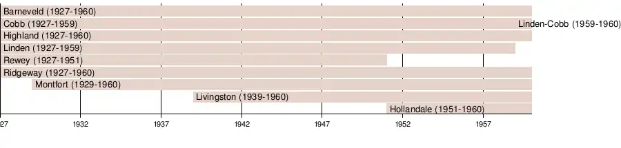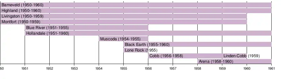 In 1950, four members of the Iowa County League (Barneveld, Highland, Livingston and Montfort) formed the initial lineup for the Iowa County League's eight-player football conference, which represented the first of its kind in southern Wisconsin.[12] Blue River and Hollandale joined for the 1951 season; Hollandale as full members outside of football and Blue River as associate members while keeping their primary membership in the Wisconsin River League.[13] Muscoda joined as the football conference's seventh member in 1954 as an associate member from the Wisconsin River League, which did not sponsor football at the time.[14] In 1955, the league expanded to nine members for football, adding Black Earth from the Suburban Six-Man Football League and Lone Rock, who made their football debut that year.[15] The Wisconsin River League began sponsorship of its own eight-player football circuit in 1956, with three members of the Iowa County League (Blue River, Lone Rock and Muscoda) shifting over.[16] They were replaced by Cobb's new football program for that season to put the membership roster at seven schools.[17] In 1958, Arena made the transition from eleven-player to eight-player football and left the Tri-County League to become associate members in the Iowa County League.[18] As smaller schools began to consolidate, the Iowa County League lost members and only five schools (Arena, Barneveld, Black Earth, Highland and Hollandale) competed in its last football season in 1960.